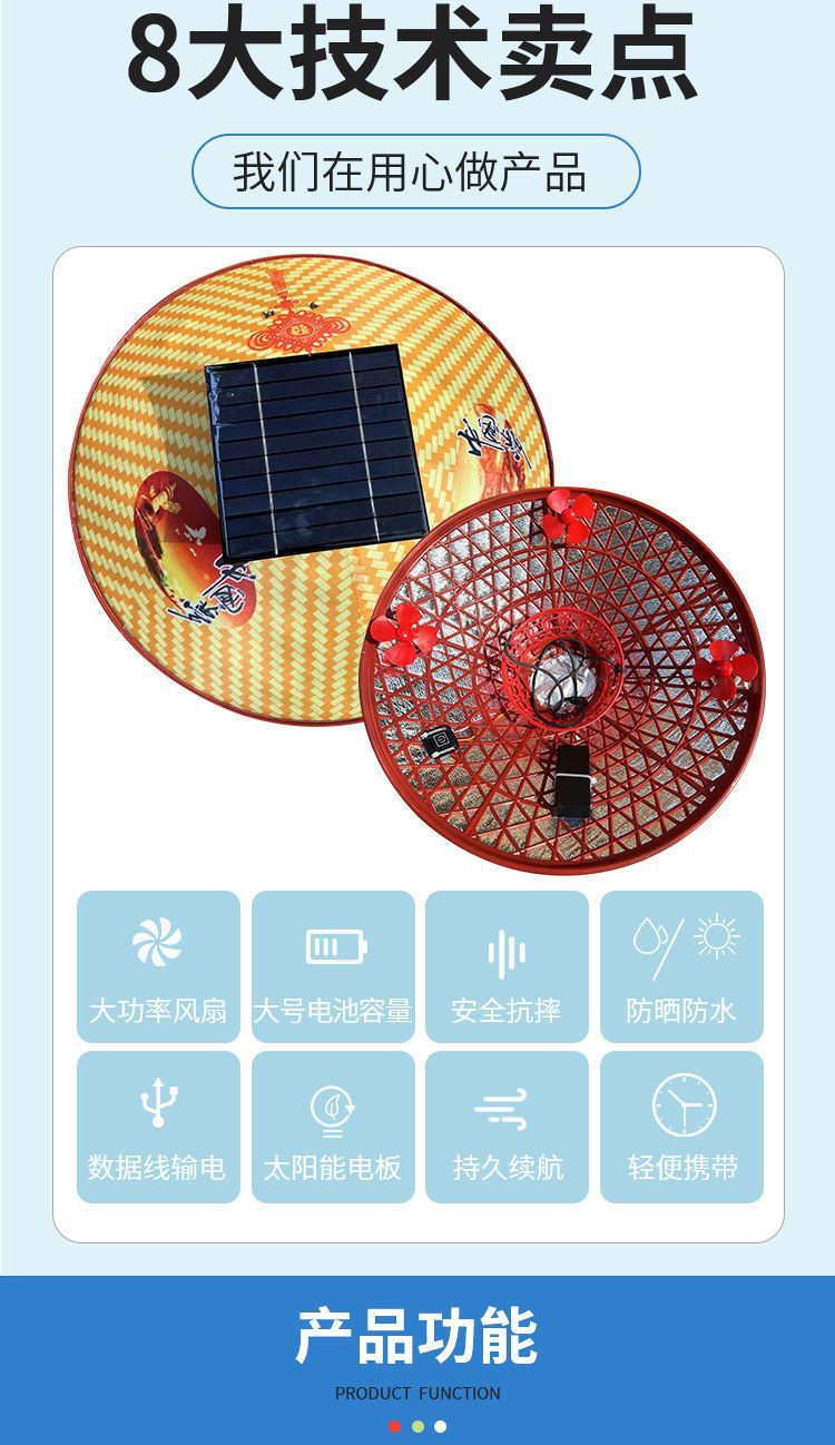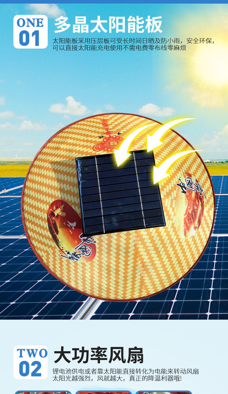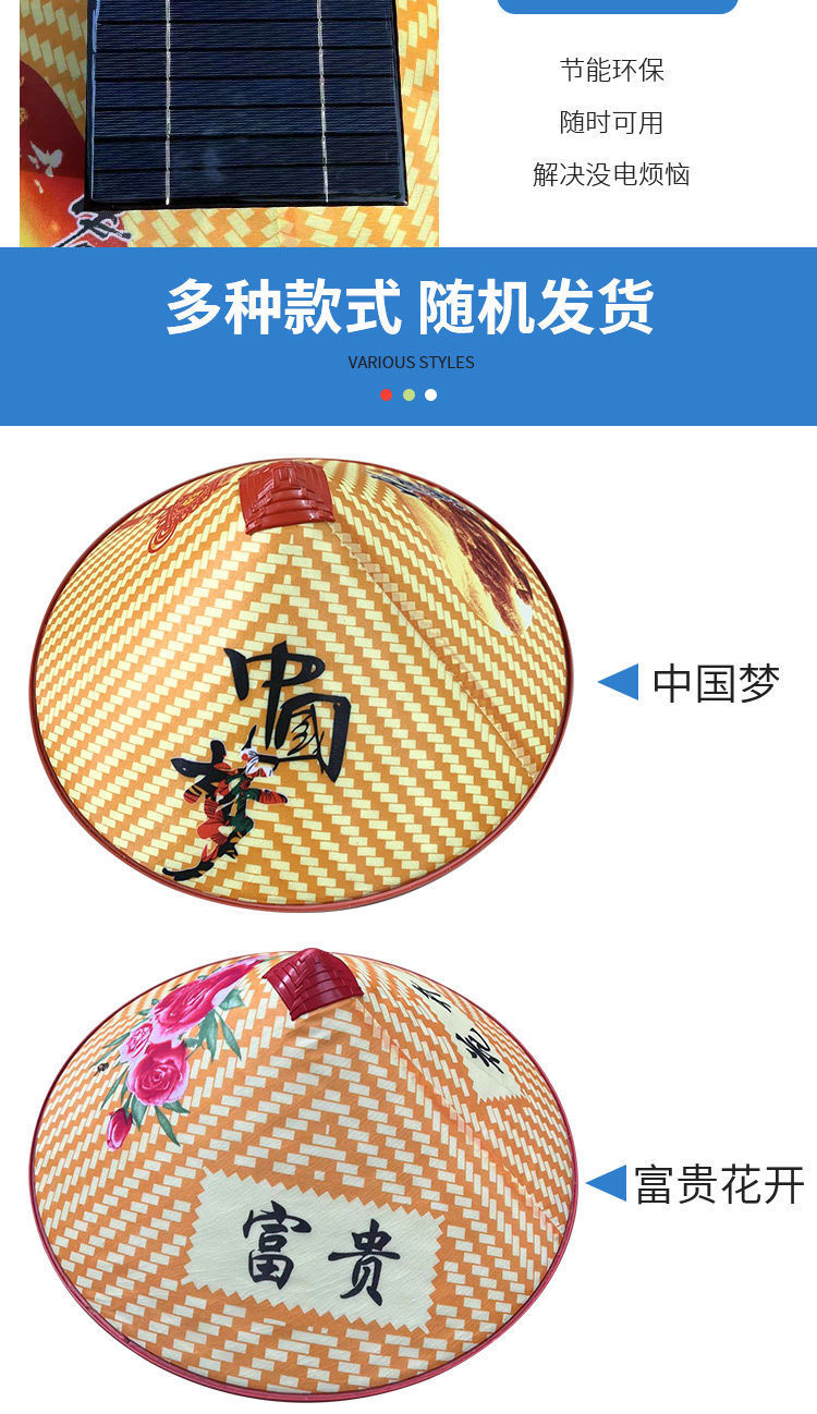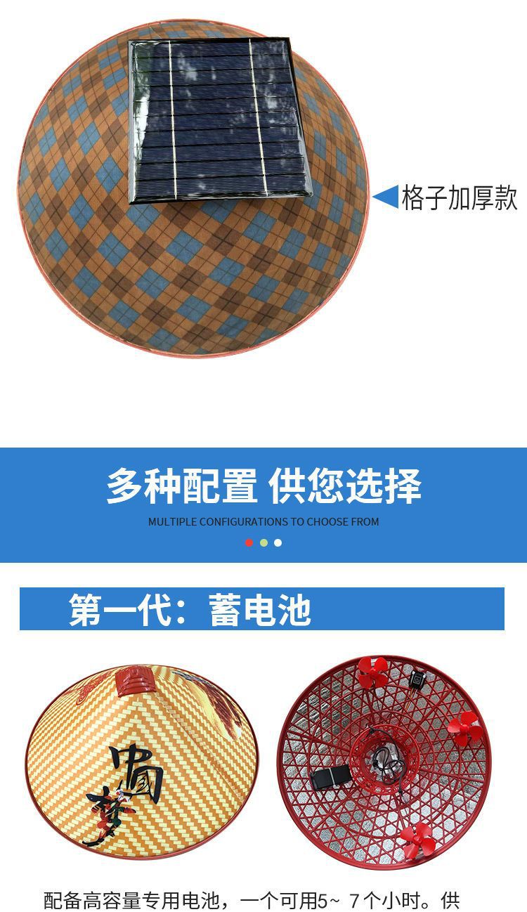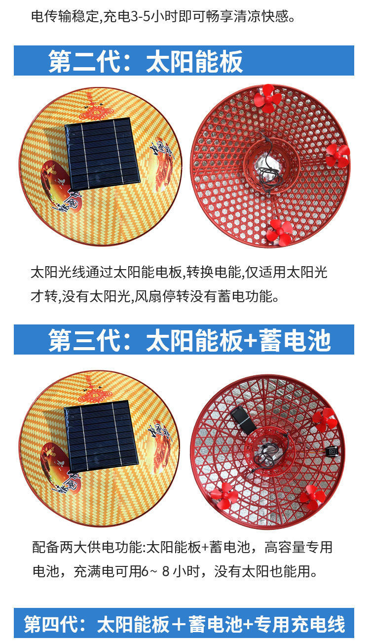 | 颜色 | 第二代【纯太阳能带动二风扇】, 第二代【纯太阳能带动三风扇】, 新一代【纯锂电带动三风扇】可调速, 第一代【纯锂电带动三风扇】不可调速, 第三代太阳能+锂电池组合 3风扇, 第四代太阳板+锂电池自动充电3风扇, 第五代【3挡调速开关边开边充】, 第6代帽加厚太阳能锂电自动充, 8代太阳能+锂电4挡大风边开边充, 10代4挡加厚太阳能锂电自动充电, 4风扇4倍风力4档电显自动充电, 5风扇5倍风力4档电显自动充电 |