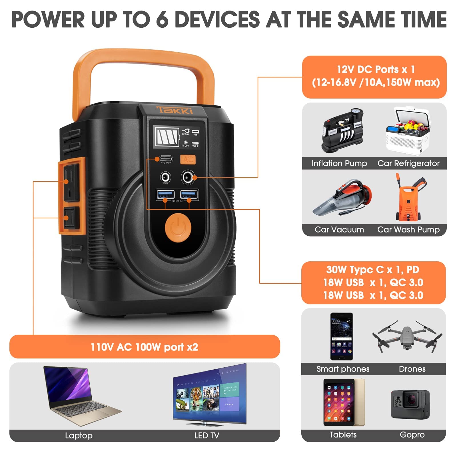 Brand:Takki Wattage:300 watts Fuel Type:Solar Power Source:Solar Powered, Battery Powered Recommended Uses For Product:Laptop,Tv,Camera,Drone Voltage:12 Volts Output Wattage:300 Watts Special Feature:便携式 Engine Type:4 Stroke Ignition System Type:Electronic Brand:Takki Wattage:300 watts Fuel Type:Solar Power Source:Solar Powered, Battery Powered Recommended Uses For Product:Laptop,Tv,Camera,Drone Voltage:12 Volts Output Wattage:300 Watts Special Feature:便携式 Engine Type:4 Stroke Ignition System Type:Electronic Frequency:60 Hz Special Features:便携式 ASIN:B09PZYBSWL Date First Available:January 8, 2022 · 【300W and 111Wh Power Station】There are multiple AC and USB, DC charging ports, you can take one of the generators out for travel or camping according to different needs. It can also be used as a gift for friends and family. · 【Compatible with Multiple Devices】The portable generators can power many equipments such as phone, laptop, drone, iPad, light, fan, CPAP, camera, TV, car fridge and so on. T88 compatible with most electronic devices below 100W. T638 compatible with most electronic devices below 300W. · The T88 backup battery power supply has LED lightpanel with 4 different levels of brightness, LED torch and SOS mode · 【3 Charging Methods】It is ideal choice for power station, you can replenish power anywhere you want. Backup battery power supply can be charged by AC direct charge, charge via 12 volt car charger, or charge in direct sunlight with 15-25 volt solar panels (solar panel not included) · T638 generators has 2*110V AC outlets (rated 300W, peak 350W), 2*DC outputs (peak 180W), can better charge most of your devices, meet different kinds of electricity demands for home,travel,camping backseat on long road trip.